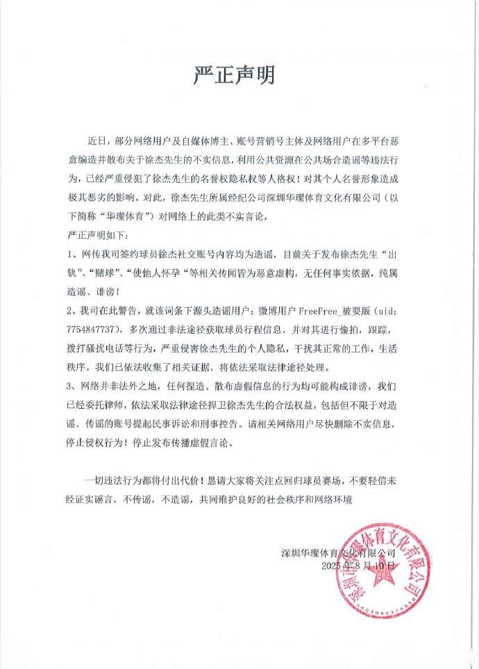 近日,部分网络用户及自媒体博主、账号营销号主体及网络用户在多平台恶意编造并散布关于徐杰先生的不实信息,利用公共资源在公共场合造谣等违法行为,已经严重侵犯了徐杰先生的名誉权隐私权等人格权!对其个人名誉形象造成极其恶劣的影响。对此,徐杰先生所属经纪公司深圳华璨体育文化有限公司(以下简称“华璨体育”)对网络上的此类不实言论,