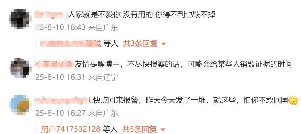 此前,她曾在评论区表示目前正在国外旅游,等回国后便第一时间去报警。