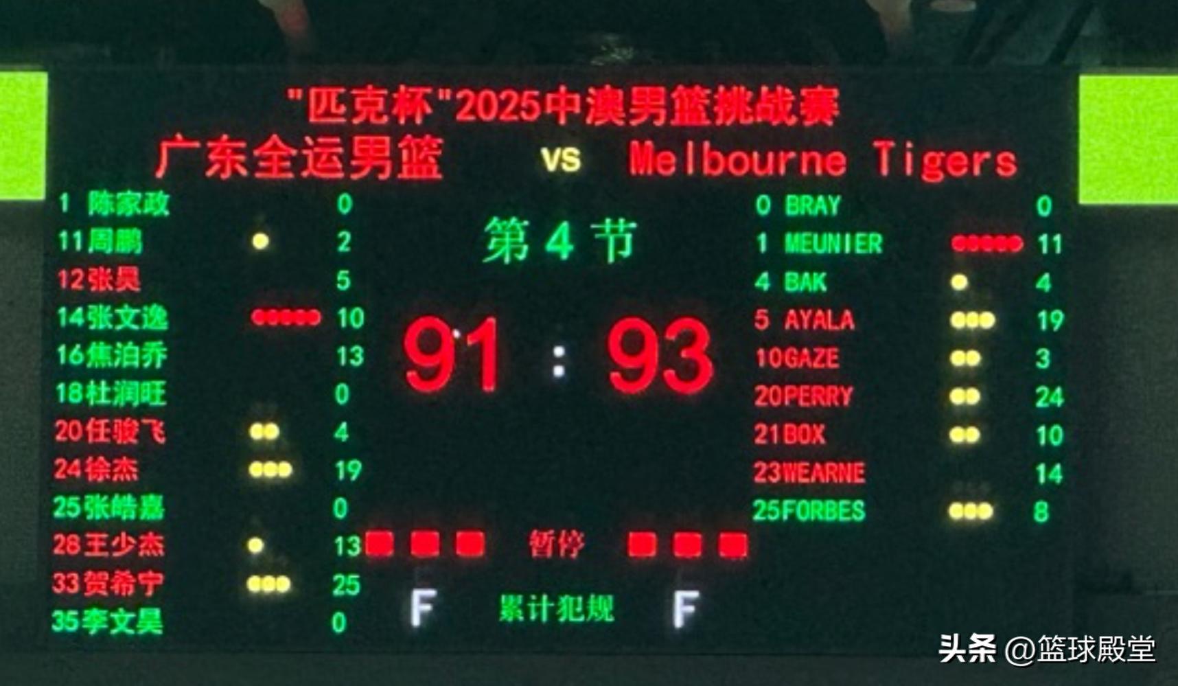 广东全运男篮 91 : 93 澳大利亚澳洲虎男篮。这场比赛广东打得非常可惜,因为最后时刻张昊持球顺下的情况下只要打进就能绝平,可惜的是,他一个人在前面没人防守,莫名其妙选择回传,最终造成的结果就是广东2分惜败,这样的结果把球迷和队友都看懵了,他的球商确实糟糕。