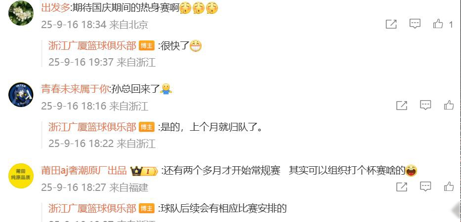并且在评论区,广厦也表态球队后续会有相应的比赛安排。反正国庆是有比赛的,之前上海公布会和浙江两支球队进行热身赛。但除了这个热身赛,其他动态还没公布出来。
