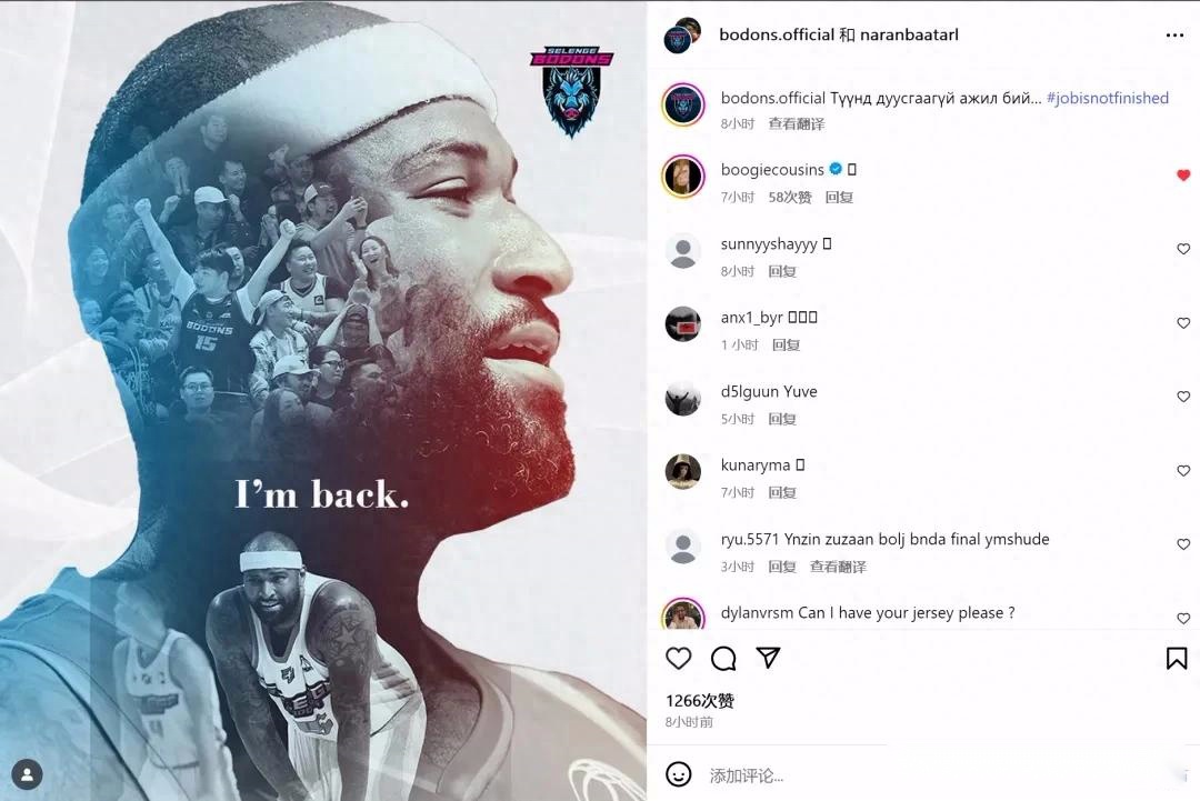 北京时间9月17日, 蒙古联赛Selenge Bodons队宣布签回德马库斯-考辛斯。 表妹本人现身评论区,回复了一个“冠军奖杯”的表情。Selenge Bodons成立于1992年,主场位于乌兰巴托,是蒙古联赛影响力最大的球队之一,多次获得联赛冠军。