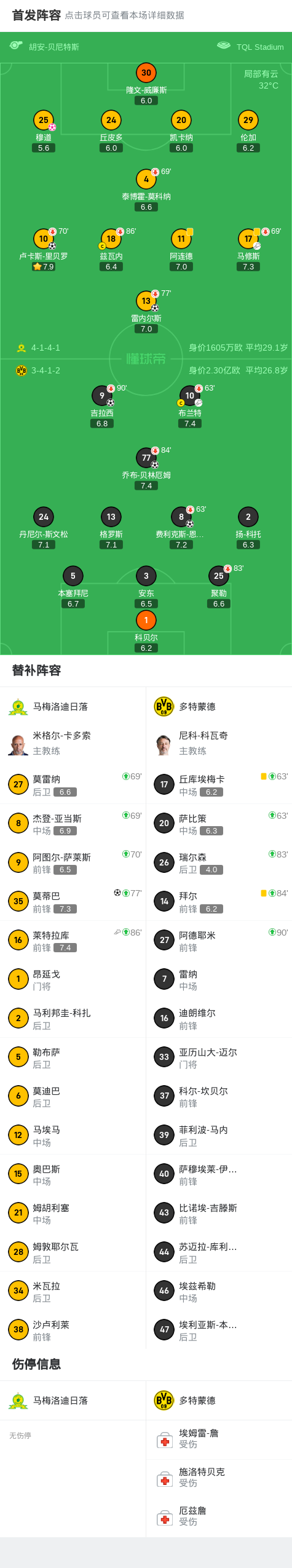 北京时间6月22日0:00,世俱杯小组赛第二轮,多特对阵马梅洛迪日落。上半场,里贝罗率先发难,随后恩梅加笑纳大礼,吉拉西破门,小贝林取得多特生涯首球;下半场,斯文松造乌龙,南非劲旅在剩余时间内再扳两球。最终,多特4-3取得胜利。