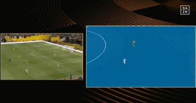 随后,半自动越位系统给出画面,确认博特拉梅在接球时处于越位位置。