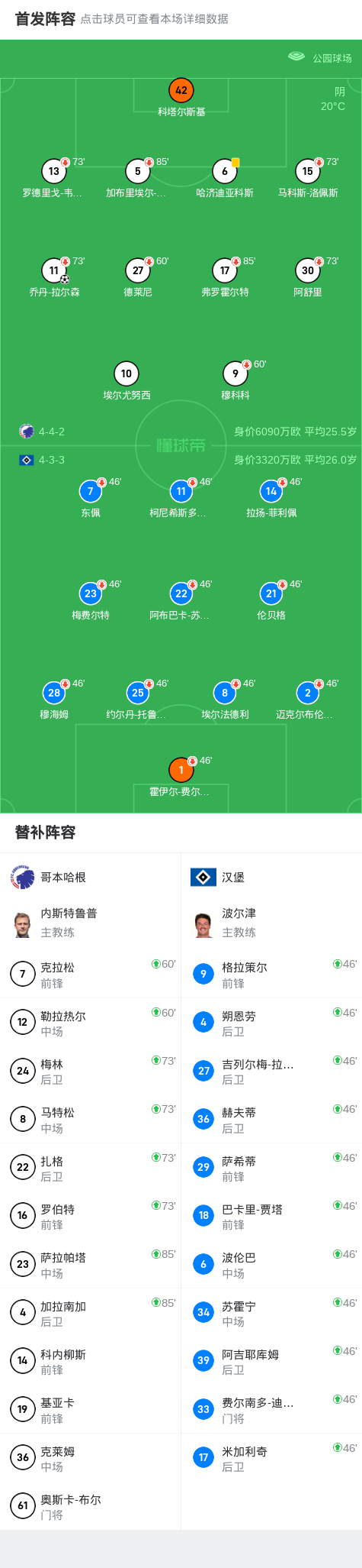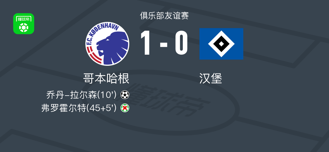 北京时间7月12日俱乐部友谊赛,哥本哈根对阵汉堡。哥本哈根乔丹-拉尔森破门。最终比分哥本哈根 1 - 0 汉堡。