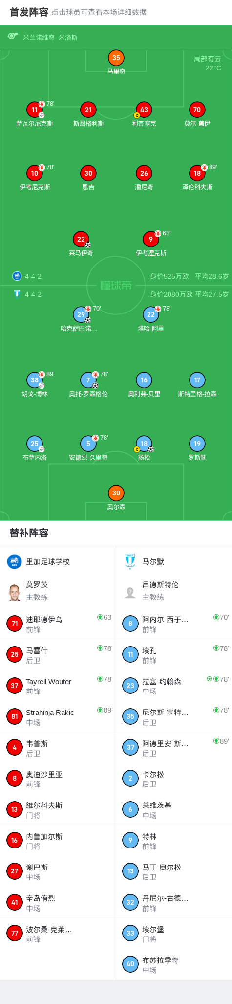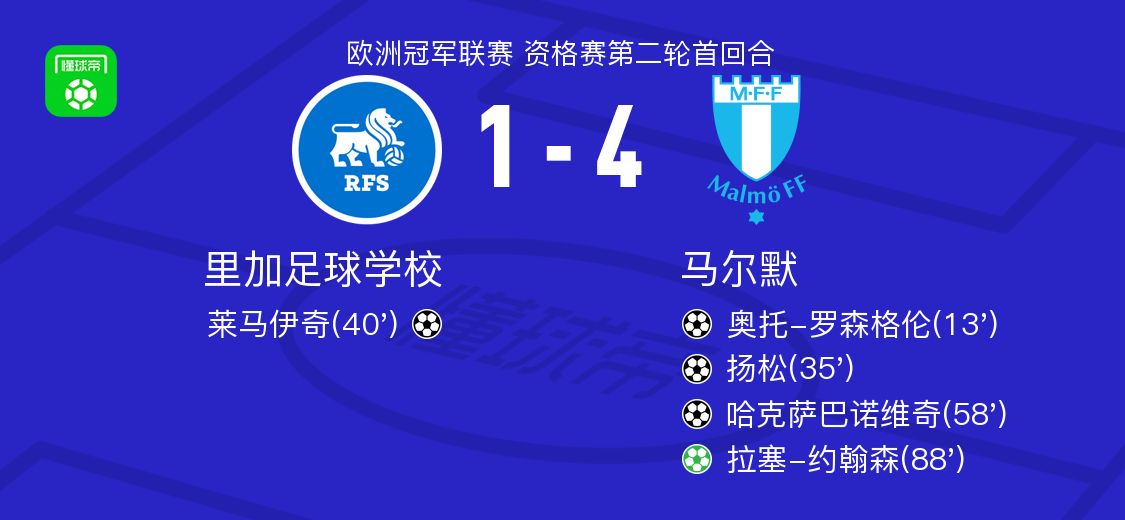 北京时间7月23日,欧洲冠军联赛资格赛第二轮首回合 较量,里加足球学校迎战马尔默。比赛第13分钟,奥托-罗森格伦为马尔默首开纪录。第35分钟,布萨内洛送出助攻,扬松破门扩大比分。第40分钟,萨瓦尔尼克斯助攻莱马伊奇为里加足球学校扳回一城。第58分钟,胡戈-博林助攻哈克萨巴诺维奇再下一城。第88分钟,拉塞-约翰森主罚点球命中。最终,马尔默以4比1的比分取得胜利。