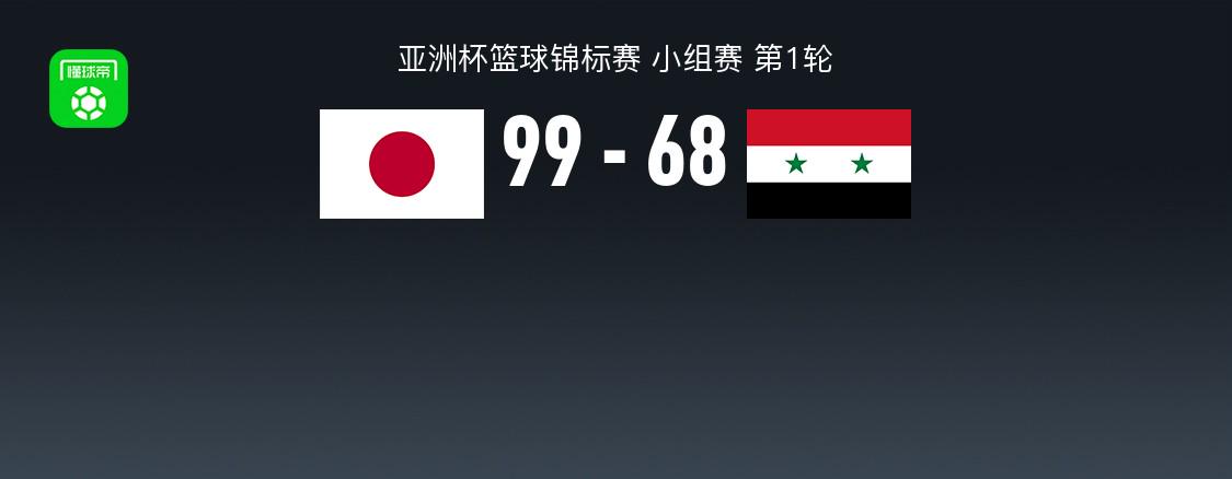 北京时间8月6日亚洲杯篮球锦标赛 小组赛 第1轮,日本男篮对阵叙利亚男篮。半场日本男篮32-41叙利亚男篮,最终日本男篮99-68叙利亚男篮。日本男篮约什-霍金森26分13板4助,富永启生18分7板;叙利亚男篮奥马尔-伊德尔比7分4板2助,马吉德-阿尔巴沙4分1板。