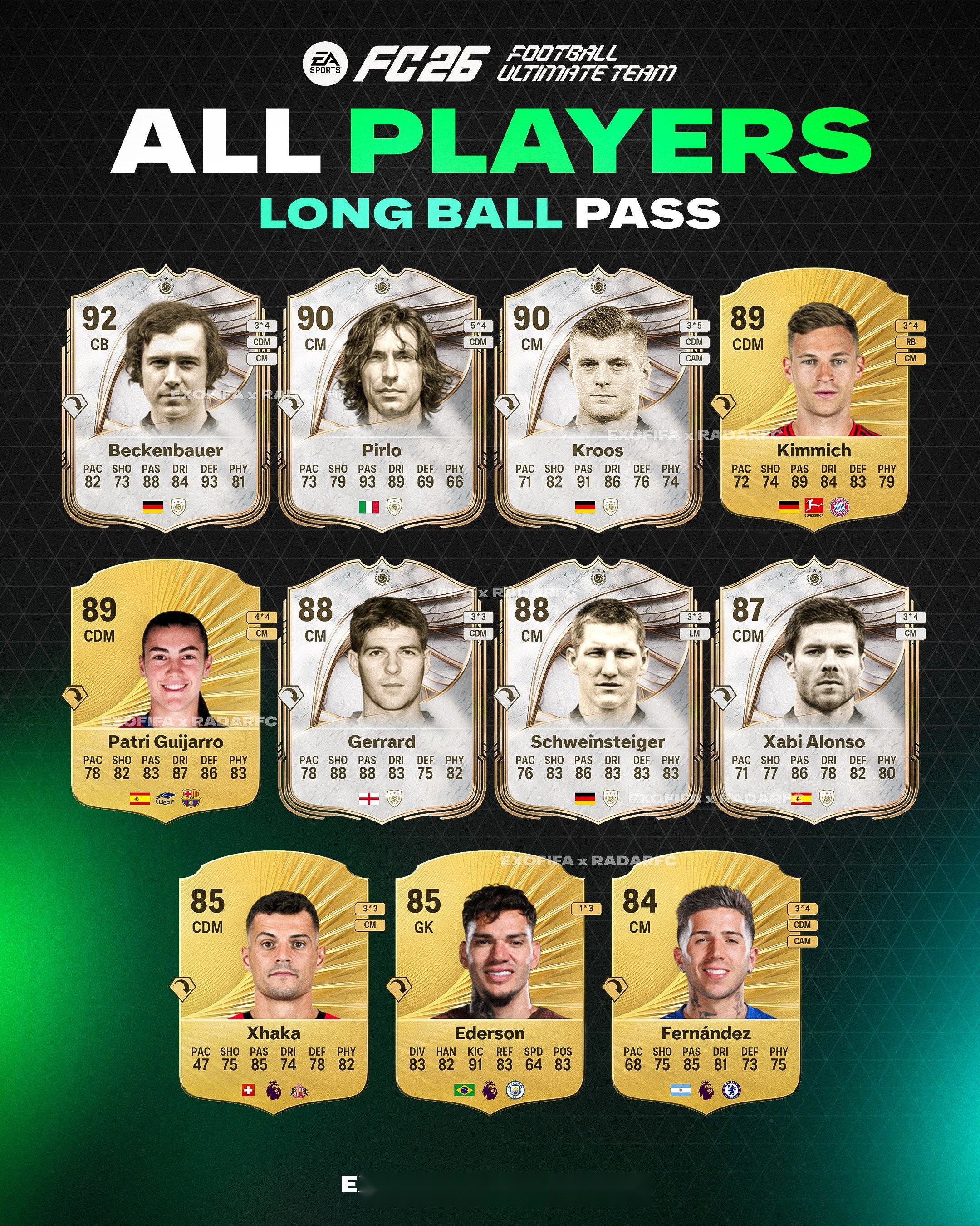 《FC26》带金长传特技的球员已经遭到曝光,其中,基米希、扎卡、埃德森、恩佐、克罗斯在列。