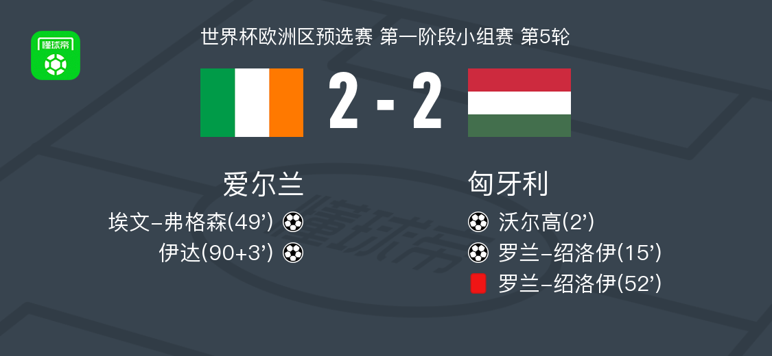 北京时间9月7日,世界杯欧洲区预选赛第一阶段小组赛第5轮,爱尔兰与匈牙利展开对决。比赛开始后不久,匈牙利球员斯泰尔斯送出助攻,沃尔高完成破门,为球队首开纪录。随后,索博斯洛伊送出精妙传球,罗兰-绍洛伊推射入网,进一步扩大领先优势。易边再战,内森-科林斯送出助攻,埃文-弗格森冷静破门,为爱尔兰扳回一城。不久之后,罗兰-绍洛伊因犯规累计两张黄牌被红牌罚下,匈牙利陷入人数劣势。比赛进入补时阶段,曼宁送出助攻,伊达破门得分,帮助爱尔兰将比分最终定格在2比2。全场战罢,双方握手言和。