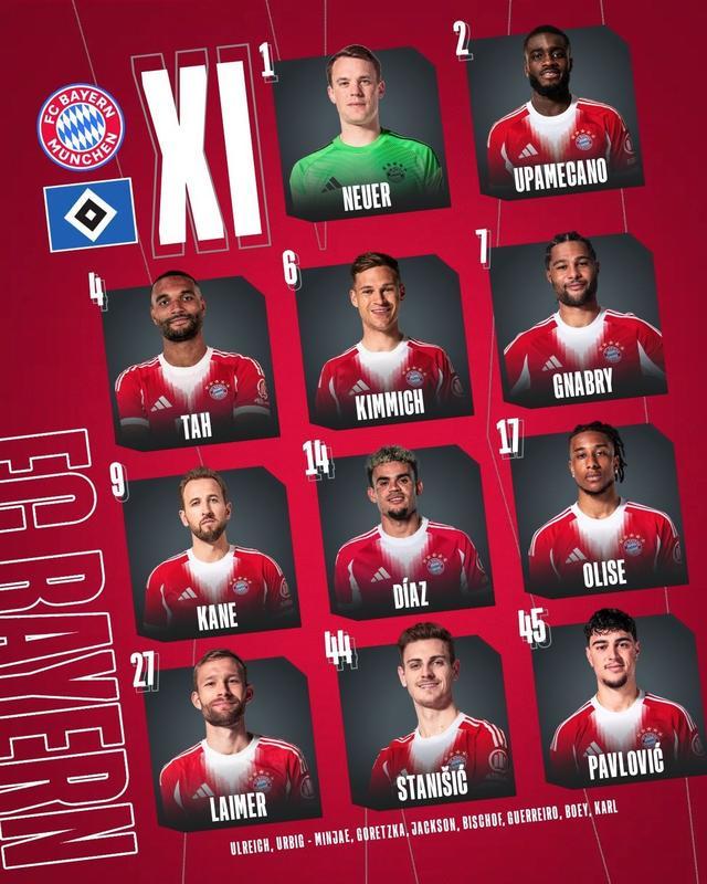 拜仁首发:1-诺伊尔、2-于帕梅卡诺、4-约纳坦-塔、44-斯坦尼西奇、45-帕夫洛维奇、6-基米希、7-格纳布里、27-莱默尔、14-迪亚斯、17-奥利塞、9-凯恩