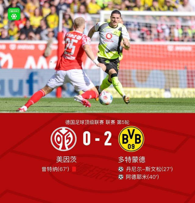 北京时间9月27日,德国足球甲级联赛第5轮展开较量,美因茨坐镇主场迎战多特蒙德。上半场,美因茨射门中柱后多特发动反击,斯文松小角度破门,随后阿德耶米长途奔袭再下一城,布兰特两度送出助攻;下半场,曾特纳出击放倒阿德耶米被红牌罚下,诺尔丹内切射门造险。最终,多特蒙德客场2-0战胜十人美因茨。