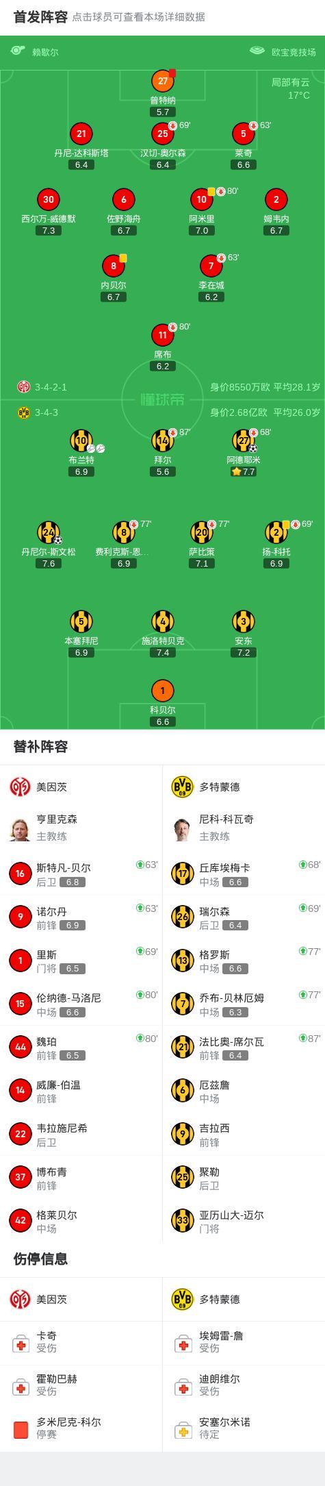 第27分钟,美因茨射门中柱,斯文松反击中小角度破门,多特1-0领先