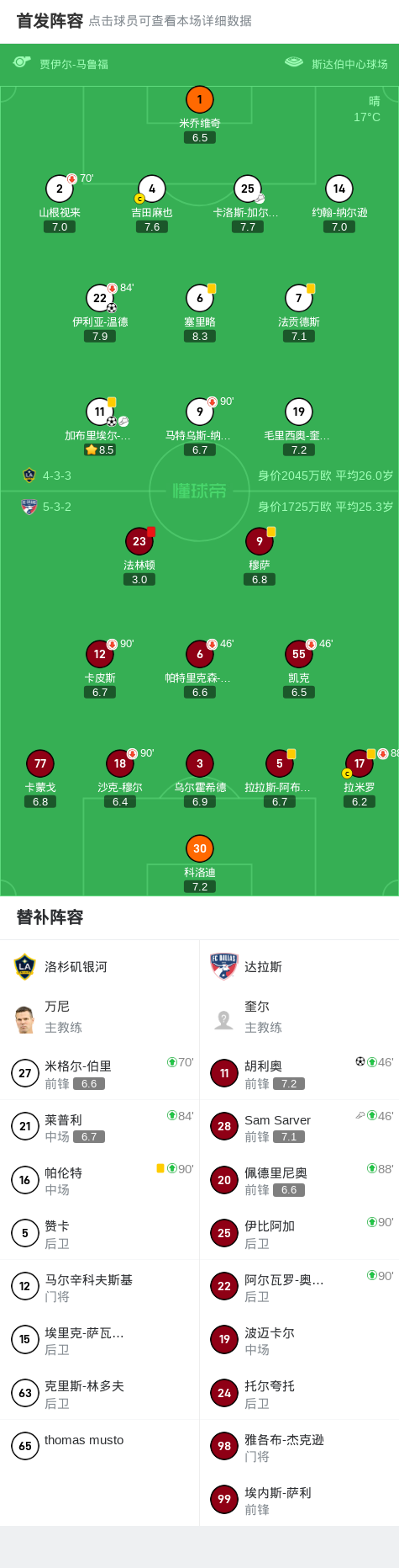 北京时间10月12日美国职业大联盟 常规赛,洛杉矶银河主场对阵达拉斯。洛杉矶银河伊利亚-温德破门,加布里埃尔-佩茨破门。达拉斯胡利奥破门。最终比分洛杉矶银河 2 - 1 达拉斯。