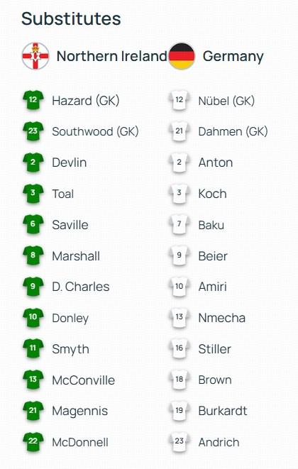 北爱尔兰: 1-法雷尔、4-巴拉德、17-麦克奈尔、5-休姆、20-斯潘塞、7-加尔布雷思、19-谢伊-查尔斯、16-麦卡恩、15-德文尼、18-杰米-里德、14-普赖斯