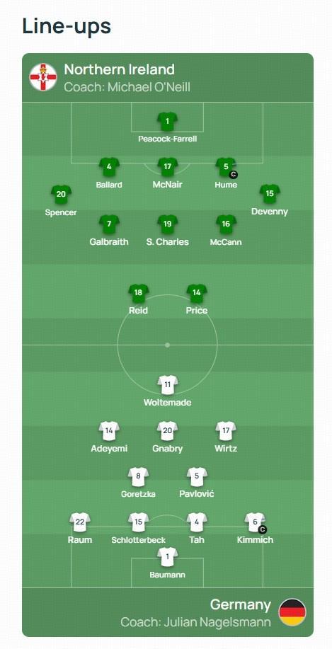 北京时间10月14日凌晨2点45分,世界杯欧洲预选第一阶段小组赛第8轮展开一场焦点战役,德国客场对阵北爱尔兰。赛前,双方公布首发阵容。