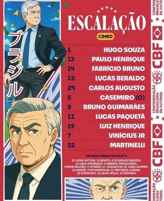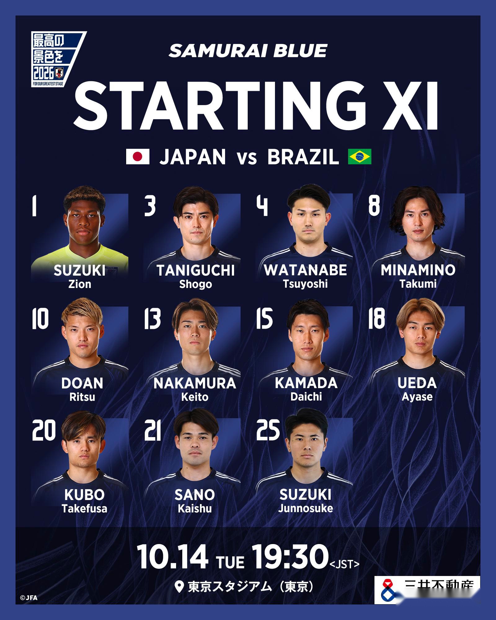 北京时间10月14日18:30,友谊赛,日本国家队坐镇主场迎战巴西国家队,赛前双方公布首发: