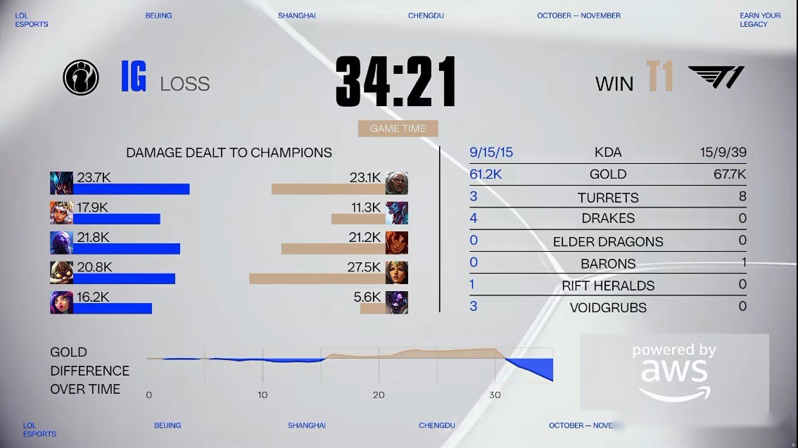 中期IG主动打厄塔汗,oner巨魔抢下厄塔汗,不过团战IG上中收割,击杀T1两人。28分钟keria牛头被打残,IG拿下火龙魂。后期30分钟IG主动抓Gumayusi希维尔,但是theshy挖掘机越塔被反杀,正面Faker岩雀抬2人,T1打出0换3后,拿下第一条大龙。最终34分钟T1在高地开团团灭IG后,拿下第一局的胜利。首局伤害最高的是Gumayusi希维尔