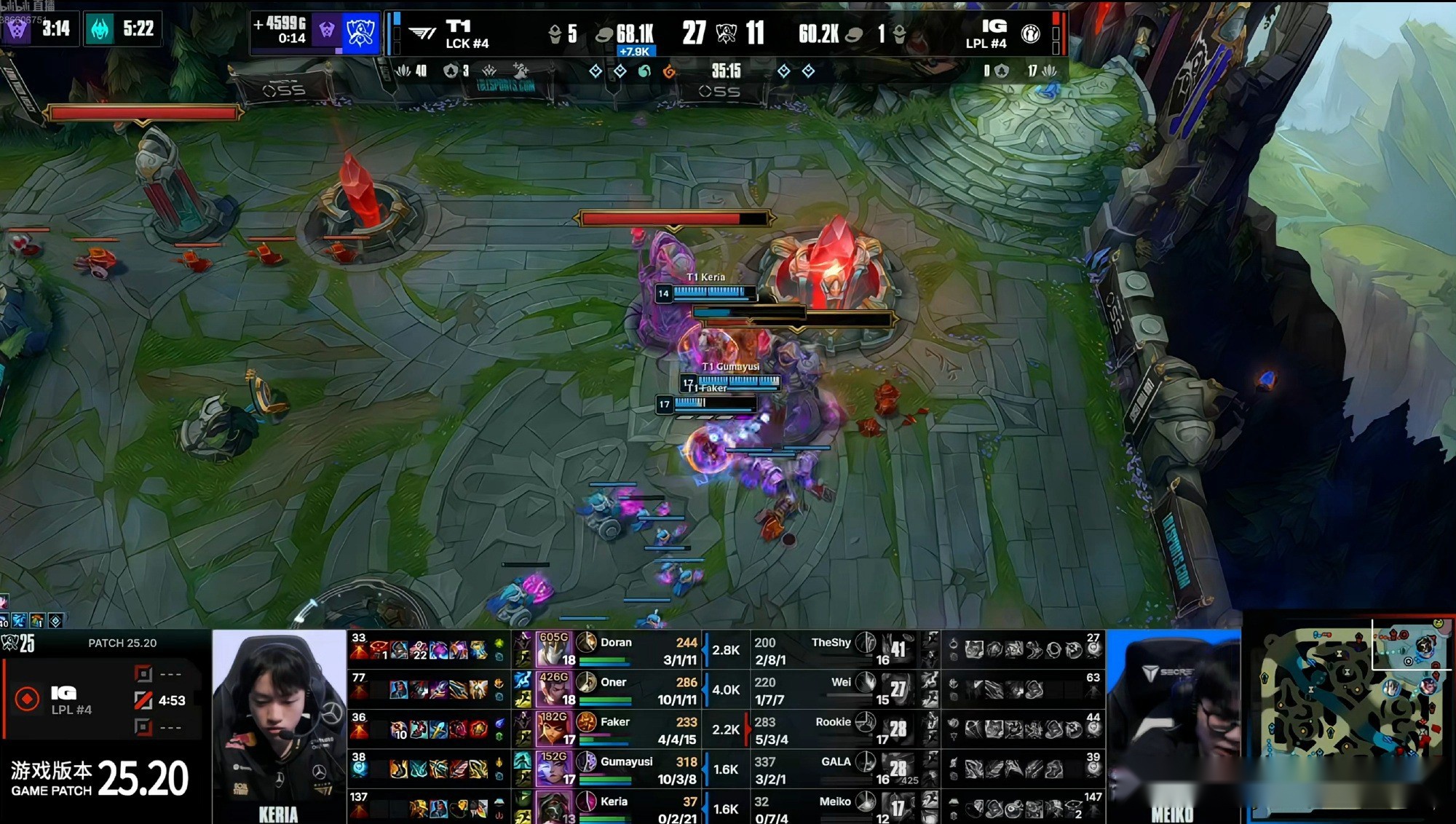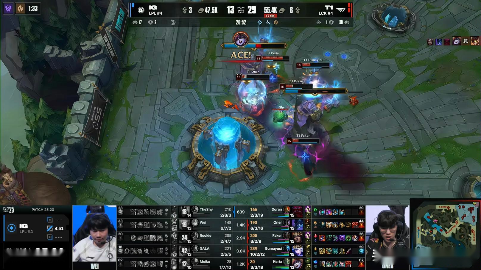 中期IG主动打厄塔汗,T1赶来阻止,双方来回混战后,T1赢下团战拿下厄塔汗。26分钟双方中路混战,Doran奥恩开团,T1轻松打出0换4后,拿下比赛的胜利。