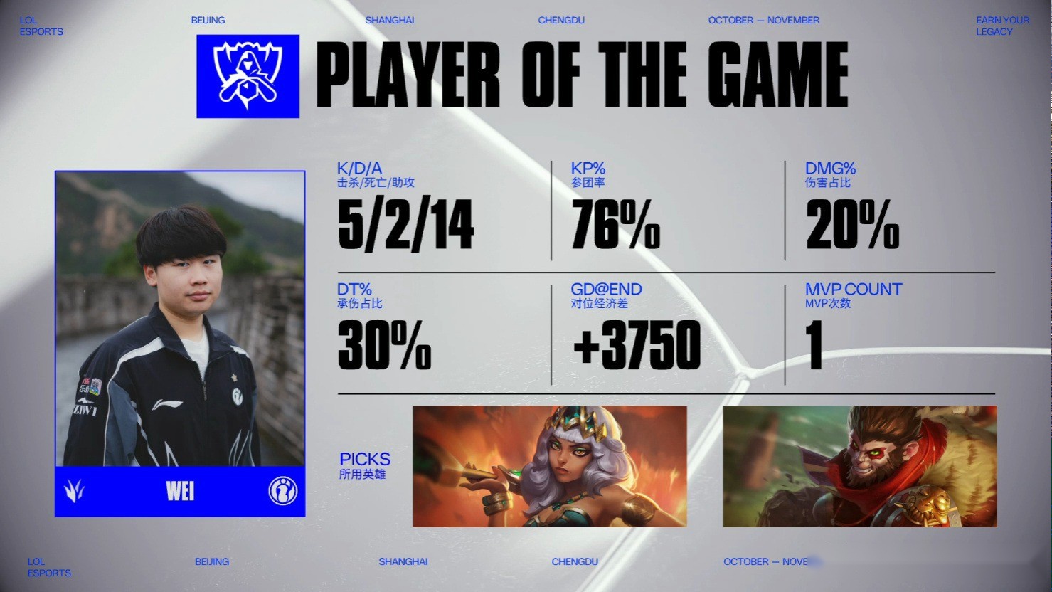 中期T1上路包夹击杀Rookie发条,之后keria洛草丛埋伏,击杀Gala女警,T1拿下厄塔汗。28分钟T1上路抓Rookie发条,Rookie走位扭掉技能,拖到IG其他人支援过来,Gumayusi女枪被秒,IG反打团灭后,拿下第一条大龙。后期IG在野区抓死Oner皇子后,拿下第二条大龙。最终37分钟IG在高地开团团灭T1后,拿下第二局的胜利。MVP给到wei猴子。
