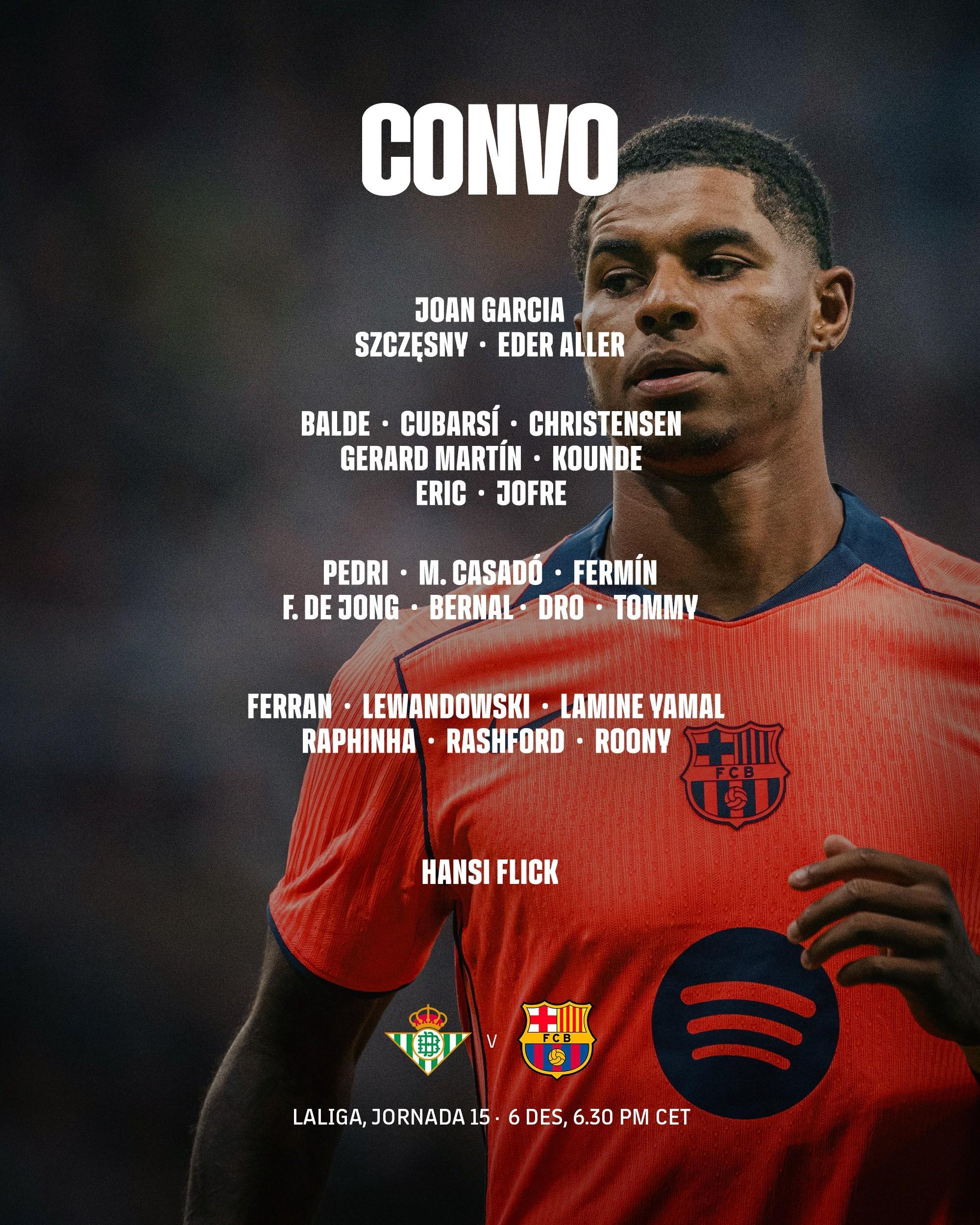 北京时间12月7日凌晨1:30,西甲第15轮,巴萨将在客场对阵皇家贝蒂斯。赛前,巴萨官方公布了本场比赛的大名单。