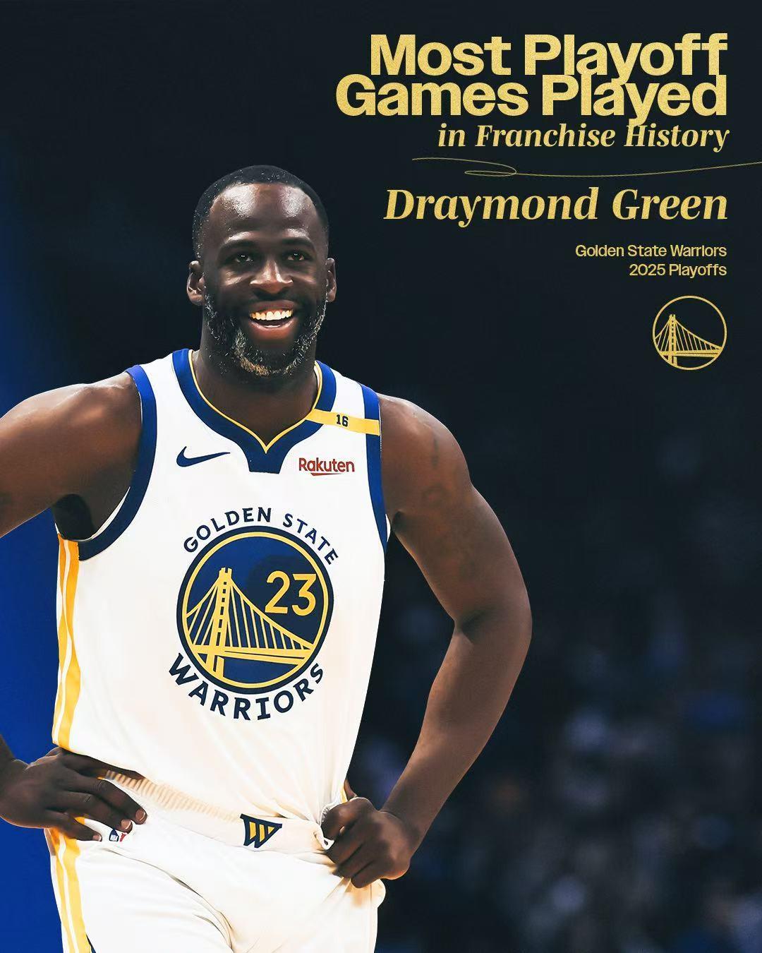 这是追梦格林勇士生涯第159场季后赛,超越克莱-汤普森,成为勇士队史季后赛出场次数最多的球员(库里为149场)。