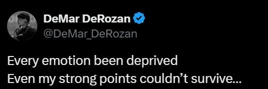 在社媒中德罗赞写道:“每种情感都被剥夺,就连我的强项也无法幸存。”