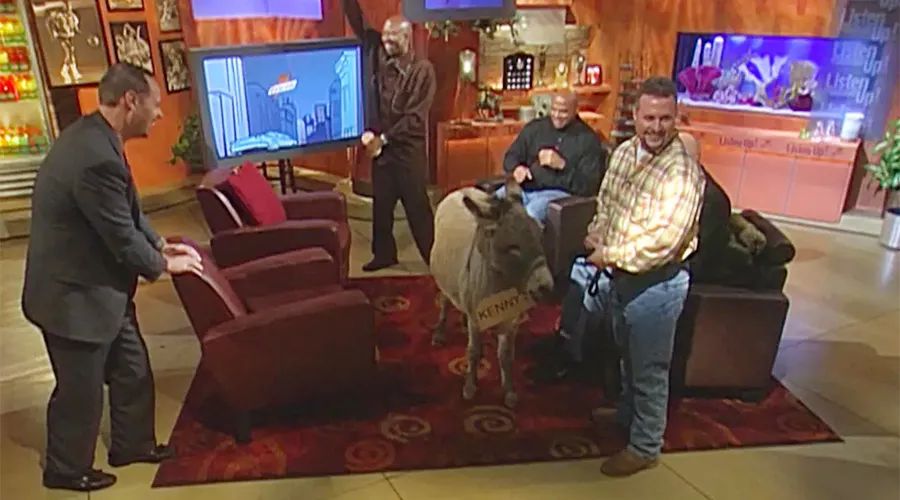 但巴克利的话语激起了姚明的斗志,仅仅生涯第8场比赛,也就是巴克利话音刚落不到一周时间,姚明就面对湖人打出了全场9投9中、独得20分的比赛。亲吻姚明屁股是断不可能的,就算巴克利愿意,姚明本人可能也未见得接受,于是名场面就此出现,肯尼·史密斯把一头驴子牵进了TNT演播室,巴克利对着驴屁股的一吻,为TNT赢得了玩得开,也玩得起的声誉。