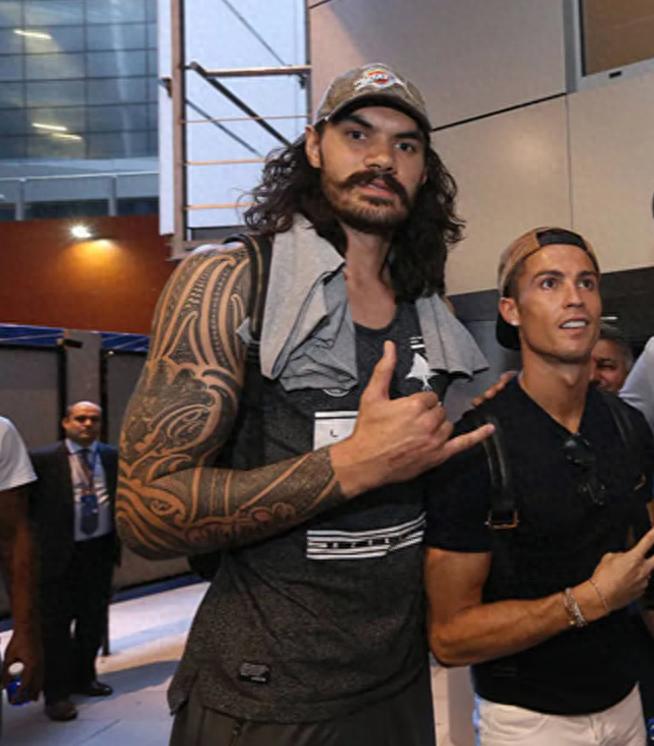 最后是奥尼尔,NBA最会运用身体中锋,跟他对位,不被打爆就值得庆祝。奥尼尔身材就像棕熊一样,2米16体重300多斤骨架又大,在内线一站,三秒区都被他占据了。这次跟强森合影,对方可是1米9一身腱子肉,不过在奥尼尔面前,强森完全就是小鸟依人的感觉。