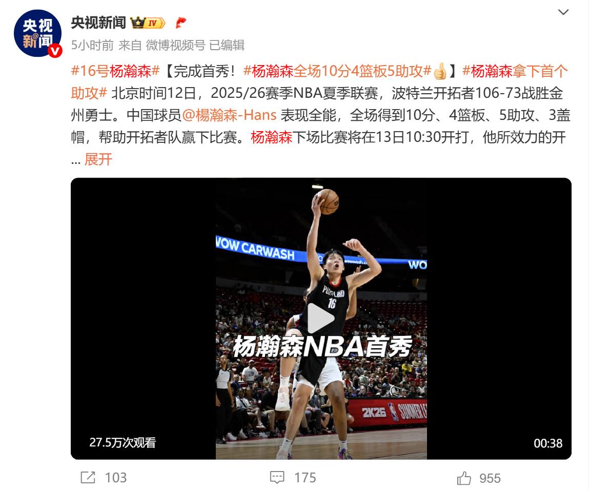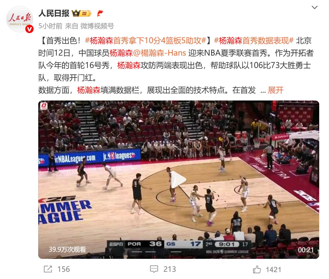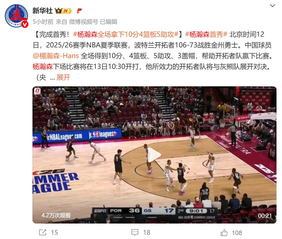 本场比赛,中国球员杨瀚森首发出战,十分出色地完成了NBA生涯的夏联首秀。