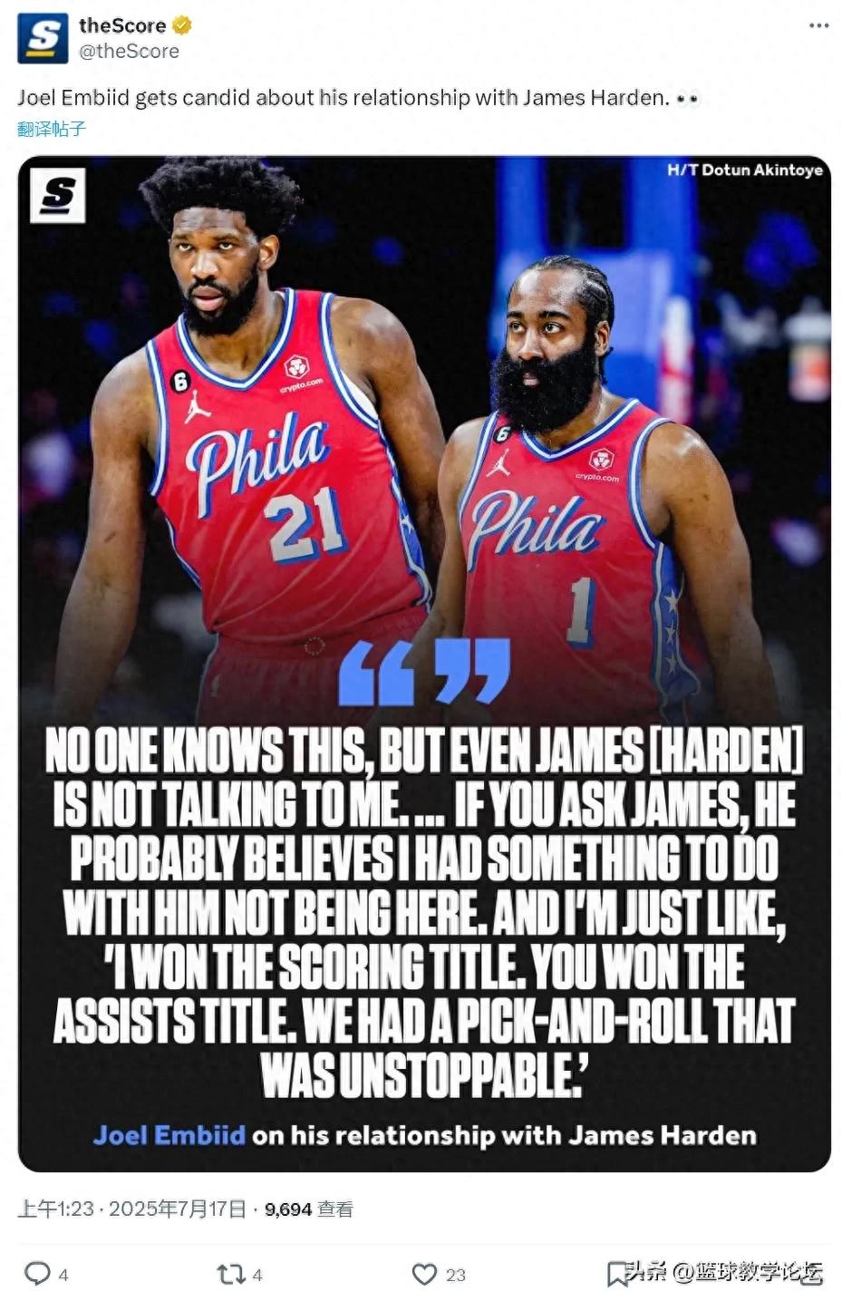 恩比德现在说他跟哈登的挡拆无人能敌,但问题是,他在季后赛几乎不给哈登挡拆,一直站在三分线外要球。2023年季后赛次轮G7, 恩比德18中5仅得到15分8篮板1助攻2盖帽4失误。 那轮系列赛,恩比德没有一场命中率超过48%!