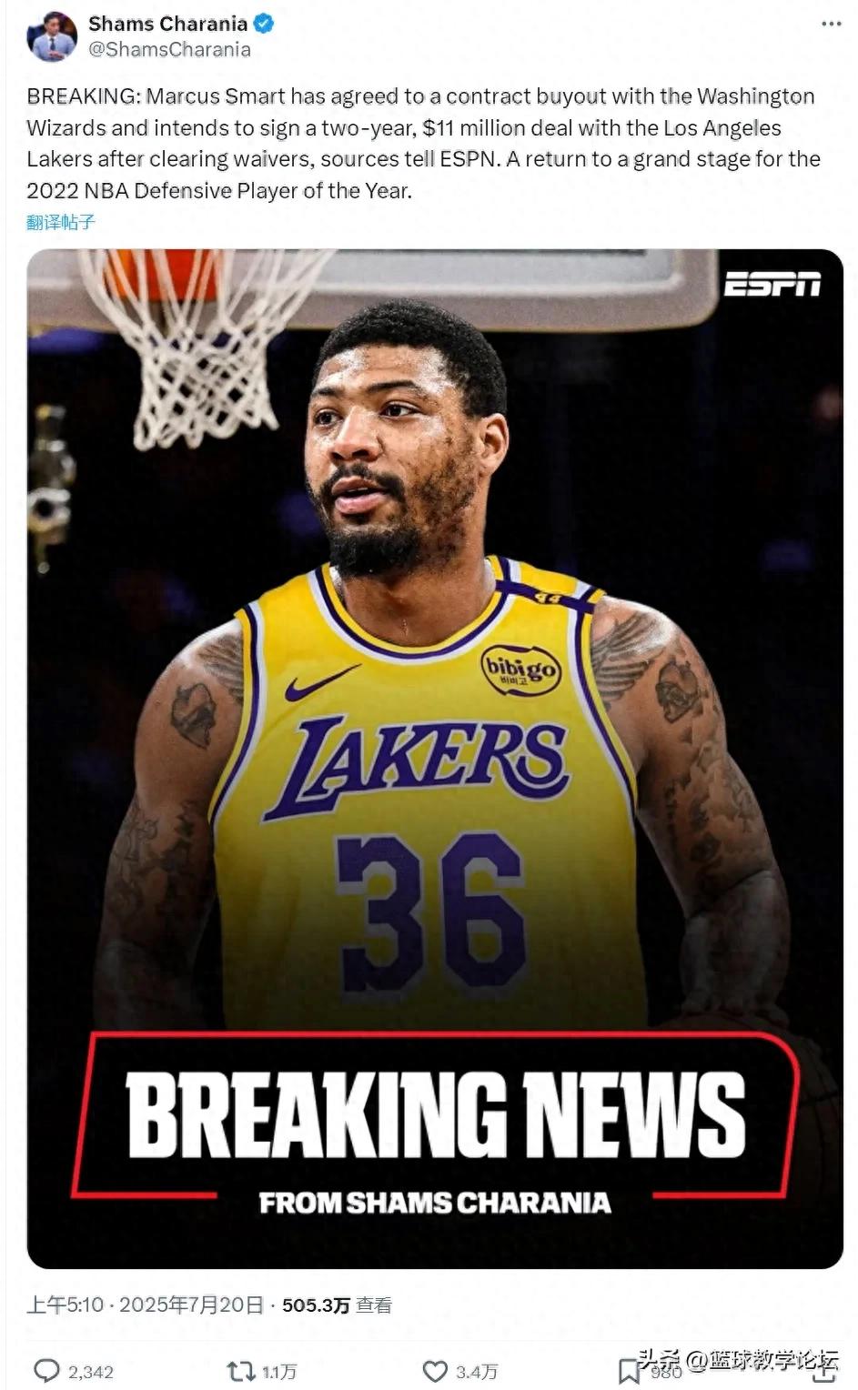 北京时间7月20日凌晨,据NBA名记Shams报道, 马库斯-斯玛特已经与华盛顿奇才达成买断协议,他将和湖人签下一份2年1100万美元的合同。 消息人士透露,提升控卫防守能力是湖人的当务之急,东契奇亲自打电话招募了斯玛特。