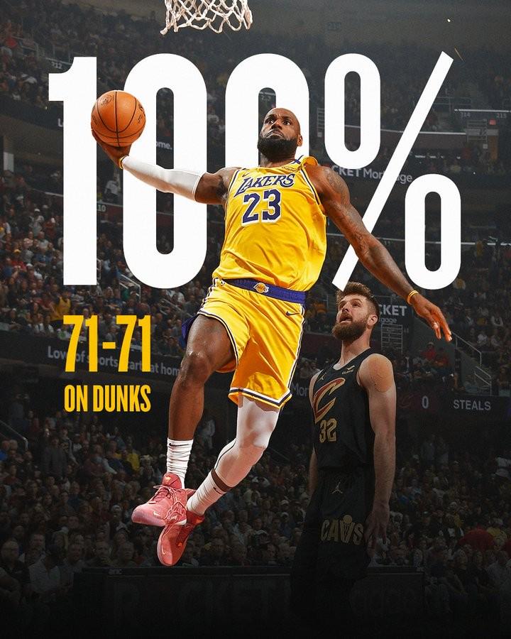 在数据统计中,詹姆斯在上赛季总共完成了71次扣篮,同时71次扣篮全部命中,联盟唯一。