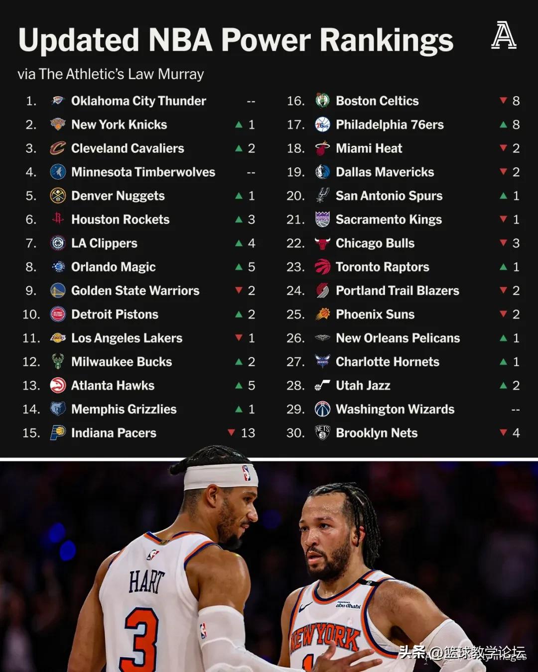 上图是美媒The Athletic根据休赛期的交易和签约,排出的NBA球队实力榜。 雷霆第1领跑全联盟,尼克斯高居第2,骑士排名第3。 得到杜兰特的火箭,只排联盟第6。签下比尔、保罗的快船,目前排第7。勇士第9,湖人仅排第11。