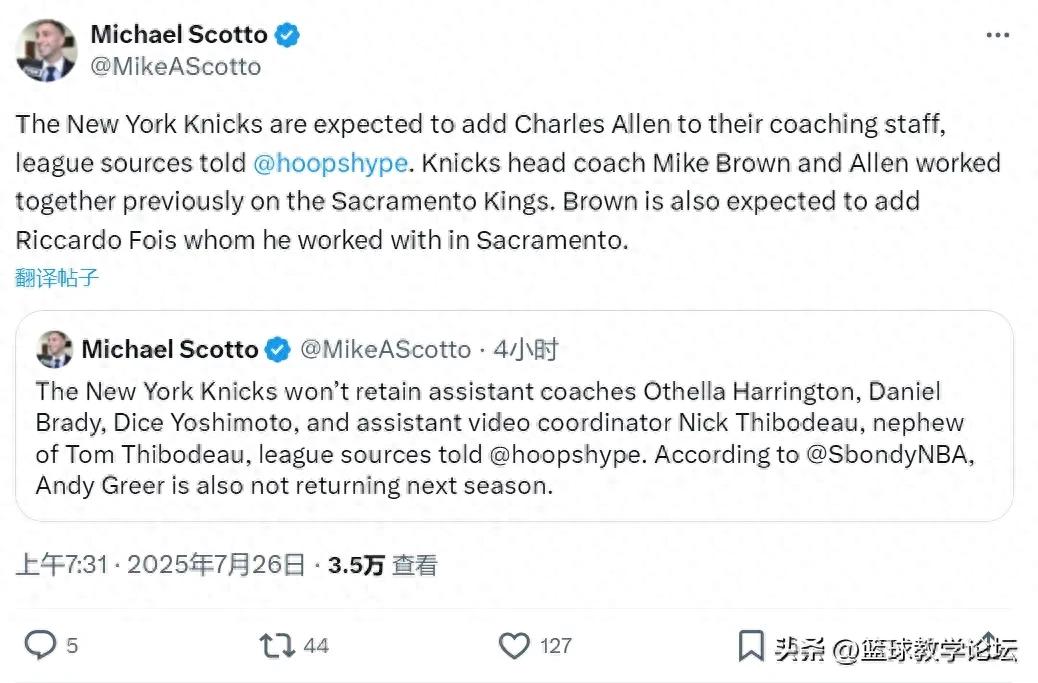 布伦森的父亲里克-布伦森,继续留在尼克斯担任助理教练,不过他在教练组的话语权会被削弱。NBA不是打打杀杀,而是人情世故。 尼克斯新帅迈克-布朗邀请查尔斯-艾伦和里卡多-福伊斯加入教练组, 他俩也是布朗在国王的助教。