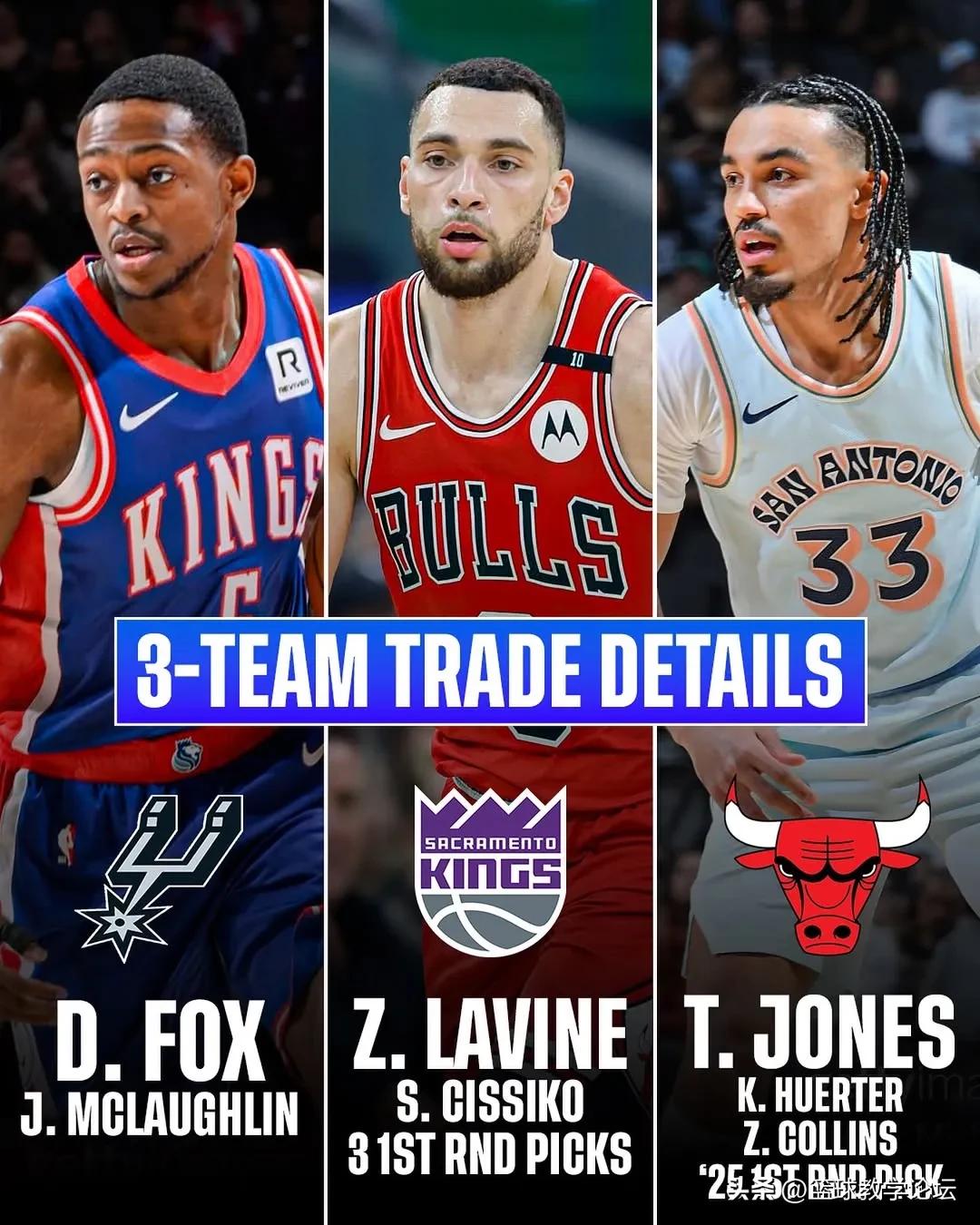 今年2月份,马刺、公牛和国王达成三方交易, 马刺送出特雷-琼斯、扎克-科林斯、西迪-西索科和3个首轮签,6换2交易得到福克斯和麦克劳林。 这3个首轮分别是2025年黄蜂乐透保护签、2027年马刺首轮签和2031年森林狼首轮签。