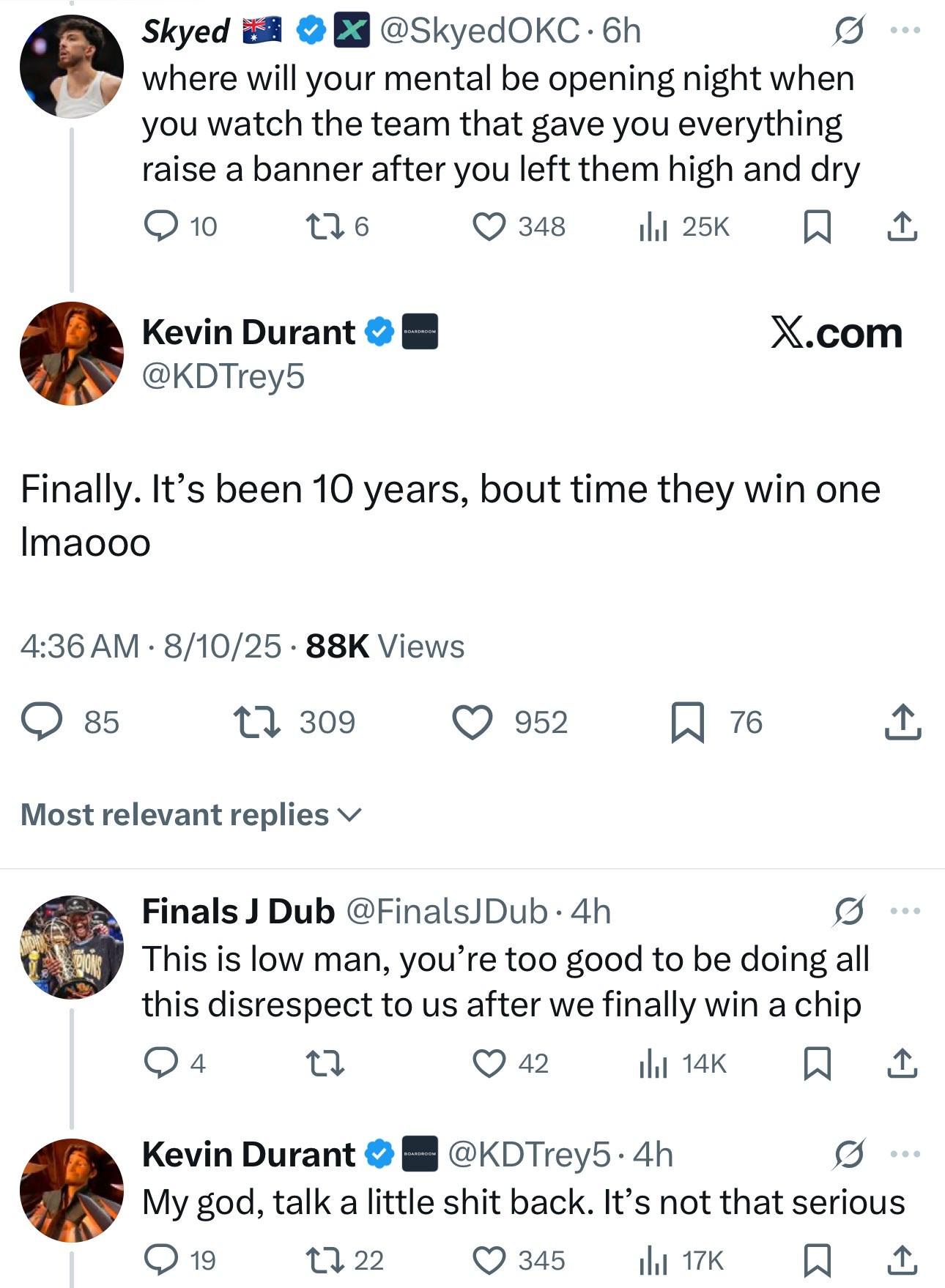 北京时间8月10日,火箭队球星杜兰特在个人社媒上与网友进行“对线”。在其中一个话题中,网友提到了杜兰特将在新赛季揭幕战中见证老东家雷霆的总冠军戒指颁奖典礼的心情。