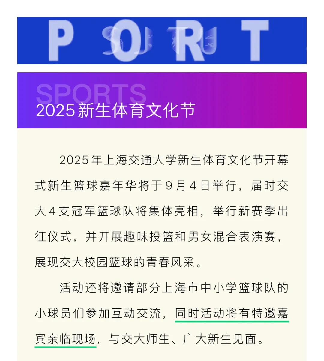 此前,上海交通大学曾在官方社媒宣布,将于9月4日开展2025新生体育文化节,会有特邀嘉宾亲临现场,而该体育文化节的合作品牌为NIKE。据悉,该活动为预约制,目前预约名额已满。