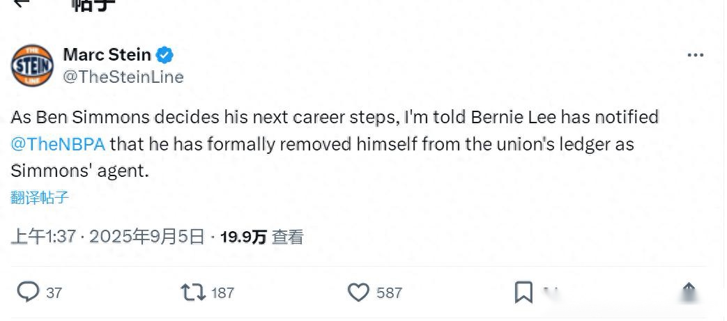 北京时间9月5日,据NBA名记Marc Stein报道, 经纪人伯尼-李已正式通知NBA球员工会,自己和本-西蒙斯分道扬镳,双方正式解约。 值得一提的是,这是两年半之内,西蒙斯第二次跟经纪人解约了,他上一个经纪人是里奇-保罗。