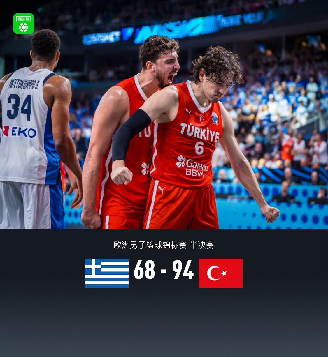 北京时间9月13日,男篮欧锦赛半决赛希腊对阵土耳其。比赛一开场,土耳其便在攻守两端完全压制希腊,半场字母哥仅得4分,土耳其49-31领先希腊,下半场希腊进攻依旧低迷,土耳其始终保持20分以上领先,最终土耳其94-68大胜希腊,晋级欧锦赛决赛对阵德国。