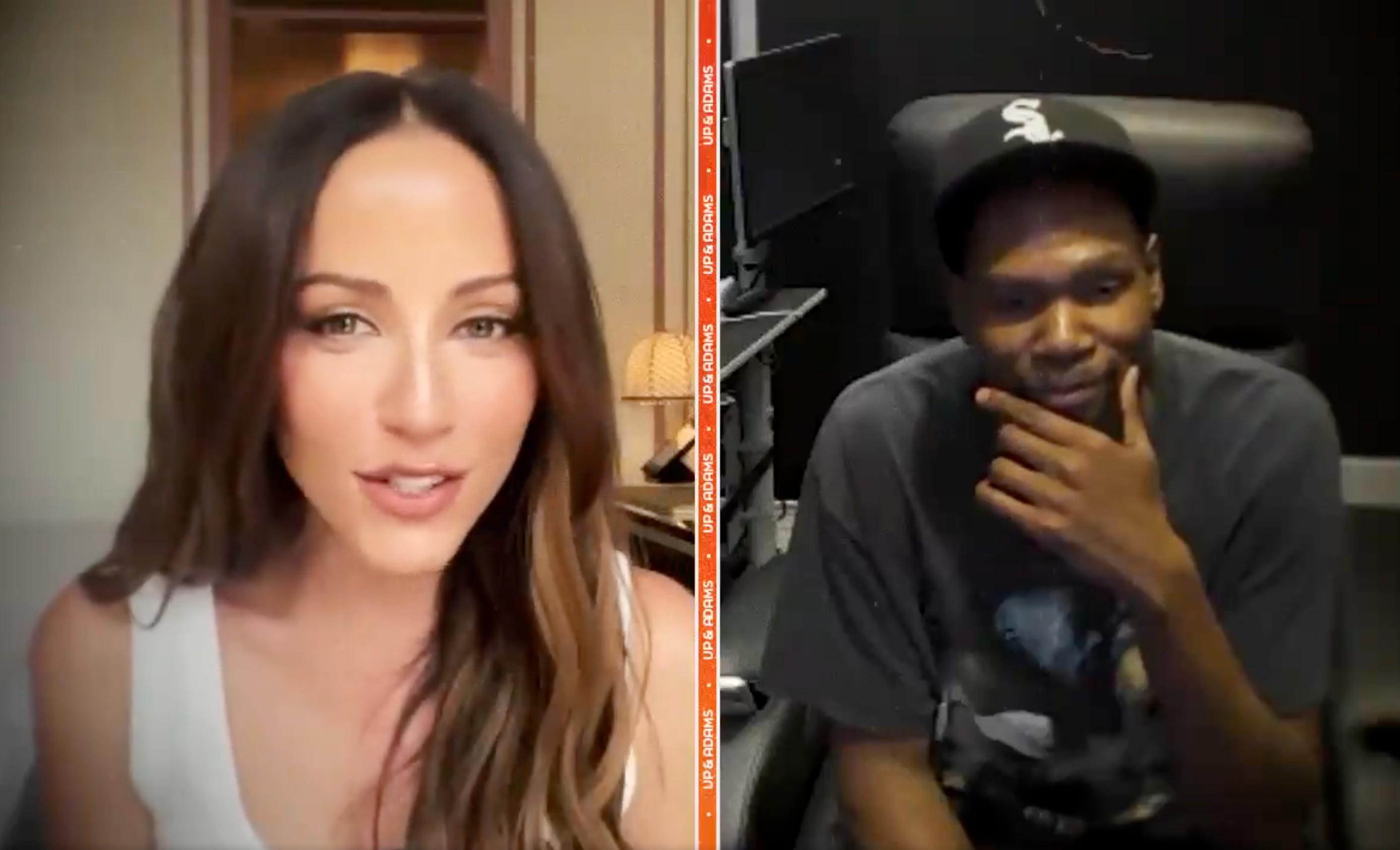 杜兰特最近参加了一档直播节目《Up & Adams》,节目中他与美女主持人凯-亚当斯的互动引爆了网络。