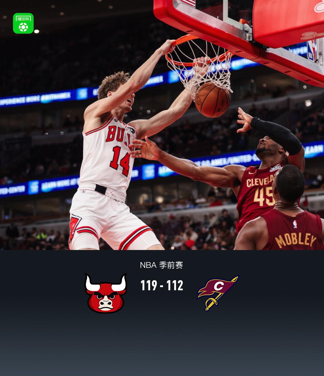 北京时间10月10日NBA 季前赛,芝加哥公牛对阵克利夫兰骑士。半场公牛50-47骑士,最终公牛117-112骑士。