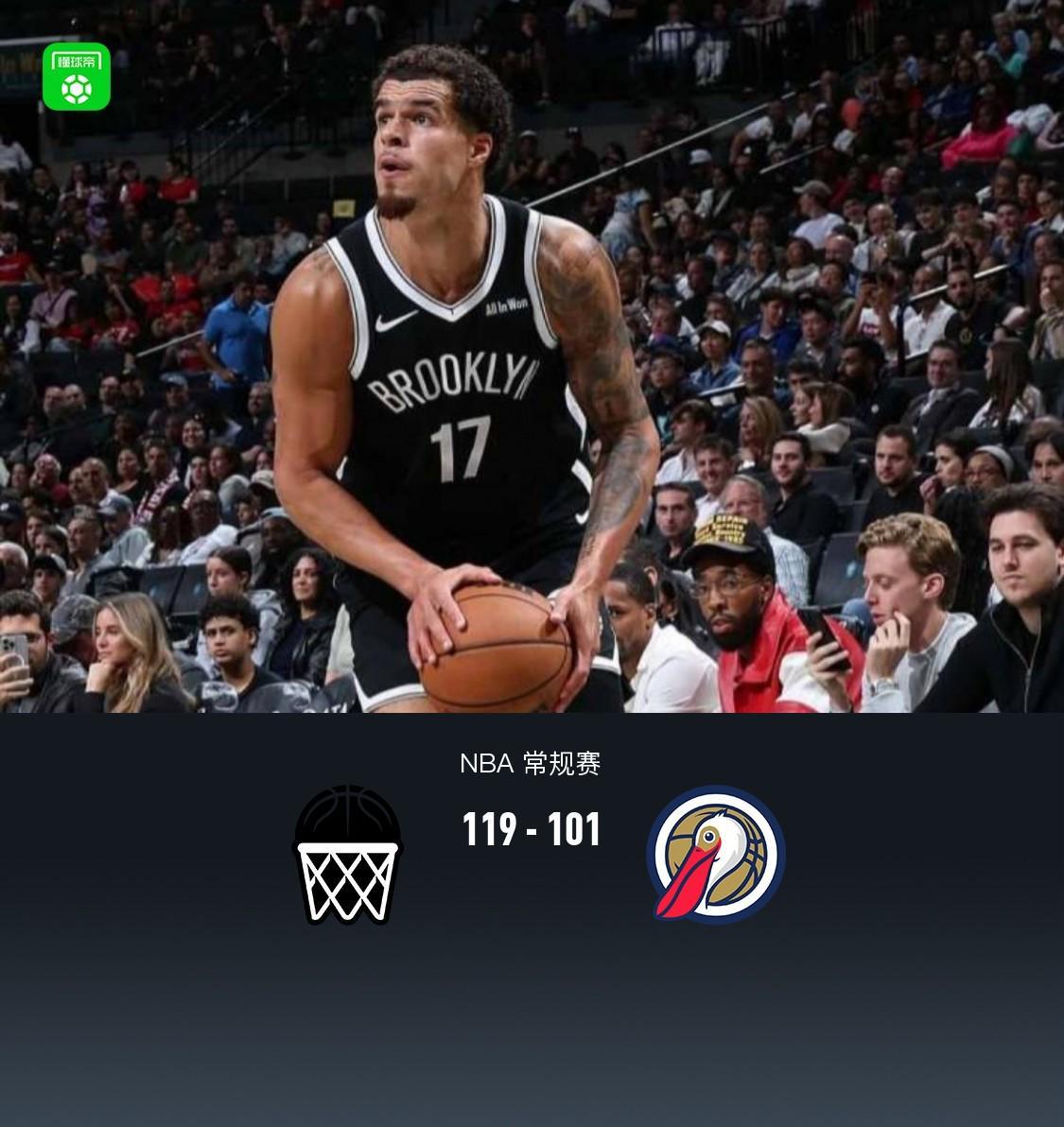 北京时间12月7日NBA 常规赛,布鲁克林篮网对阵新奥尔良鹈鹕。上半场篮网波特22分带队建立近20分领先,半场篮网62-44鹈鹕,下半场鹈鹕无力反扑,最终篮网119-101鹈鹕。