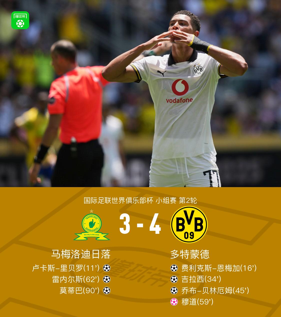 北京时间6月22日0:00,世俱杯小组赛第二轮,多特对阵马梅洛迪日落。上半场,里贝罗率先发难,随后恩梅加笑纳大礼,吉拉西破门,小贝林取得多特生涯首球;下半场,斯文松造乌龙,南非劲旅在剩余时间内再扳两球。最终,多特4-3取得胜利。