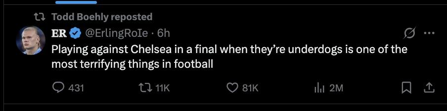 社媒上,一曼城球迷号写道,在决赛中面对被看低的切尔西,可能是足坛最令人胆寒的情形之一。随后,切尔西主席伯利转发了该条社媒。
