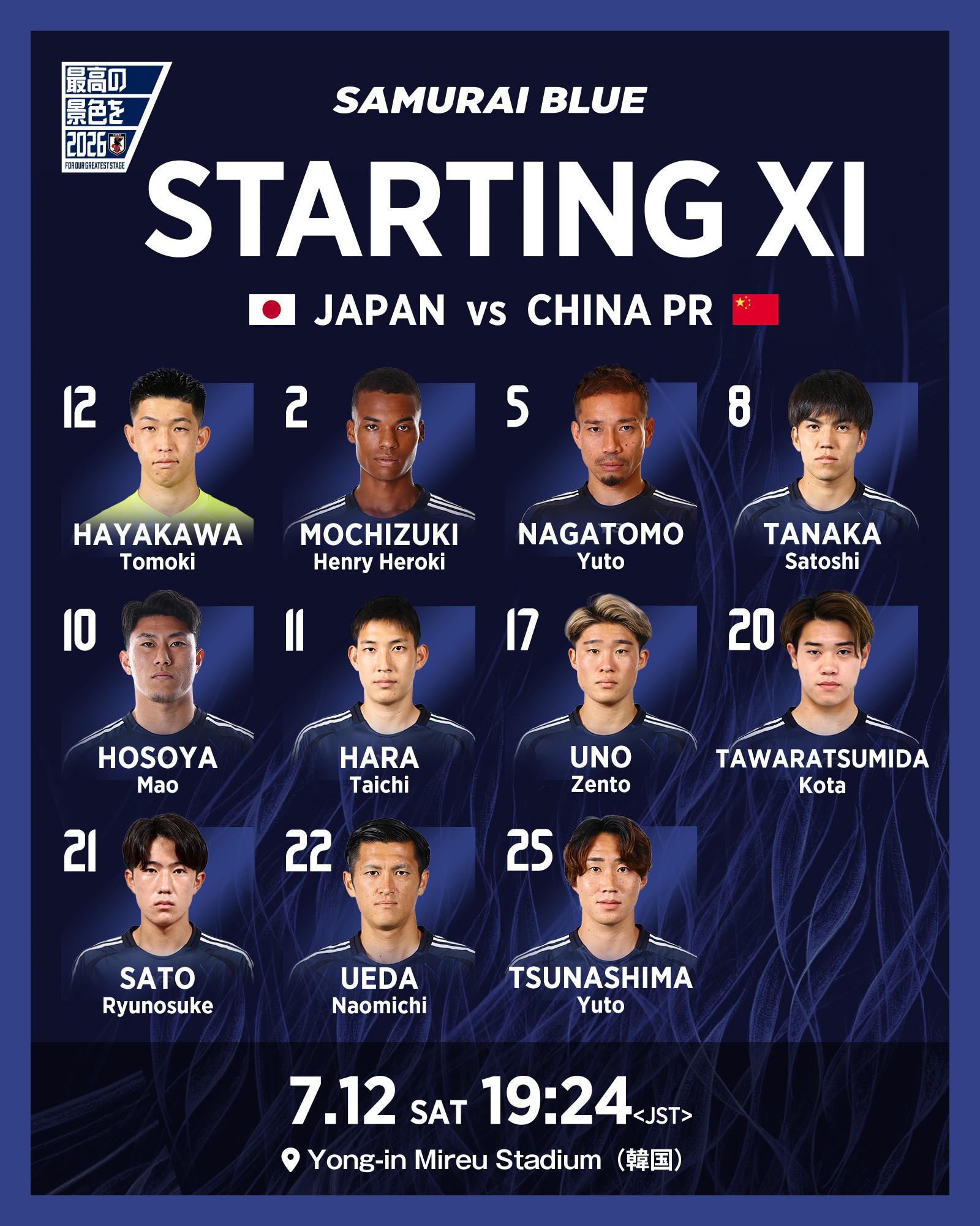 北京时间7月12日18:24,东亚杯第2轮,中国队对阵日本,本场比赛在韩国首尔龙仁龙体育场进行,赛前双方首发出炉。