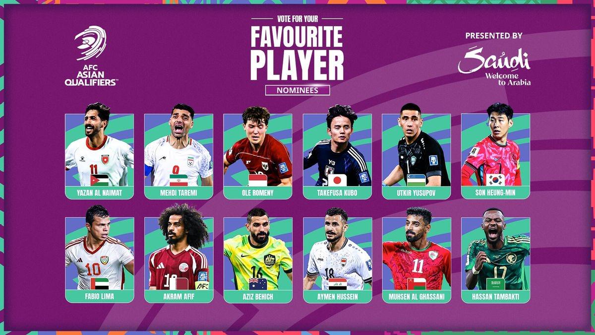亚足联官网公布了世预赛亚洲区第三阶段球迷票选最佳球员的候选名单,其中孙兴慜、久保建英领衔,塔雷米、罗梅尼、阿菲夫、比伊奇、坦巴蒂等人入选。