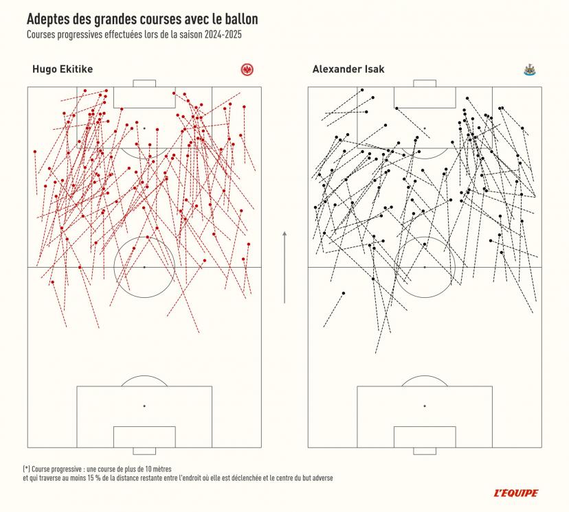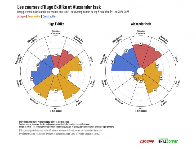 埃基蒂克和伊萨克都能持球推进、与队友配合、连接不同阵线,同时为自己创造大量机会,因此他们在很多方面确实很相似。然而,深入分析两人的技术特点后,仍能发现一些显著差异。为了更好地理解这些区别,我们将关注两人无球跑动的表现(与上述带球跑动不同)。