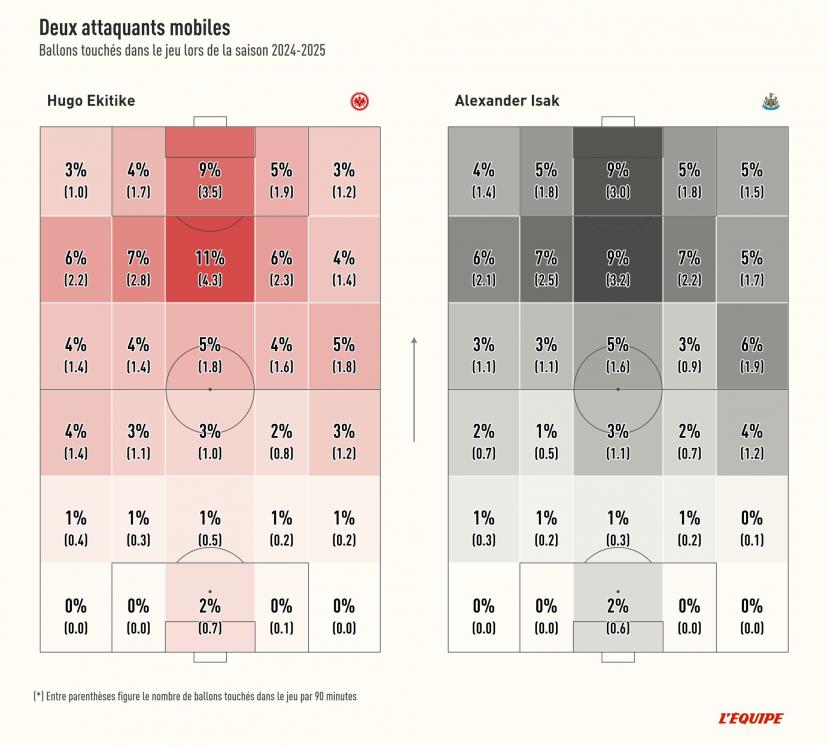 首先,从体型上看,他们有着难以忽视的相似之处。埃基蒂克和伊萨克身高都接近1.90米,身材修长,同时他们也是欧洲五大联赛中速度最快的前锋之一。不过,他们并非单纯的“空间利用机器”。两位新中锋都展现出强烈的参与比赛的意愿。