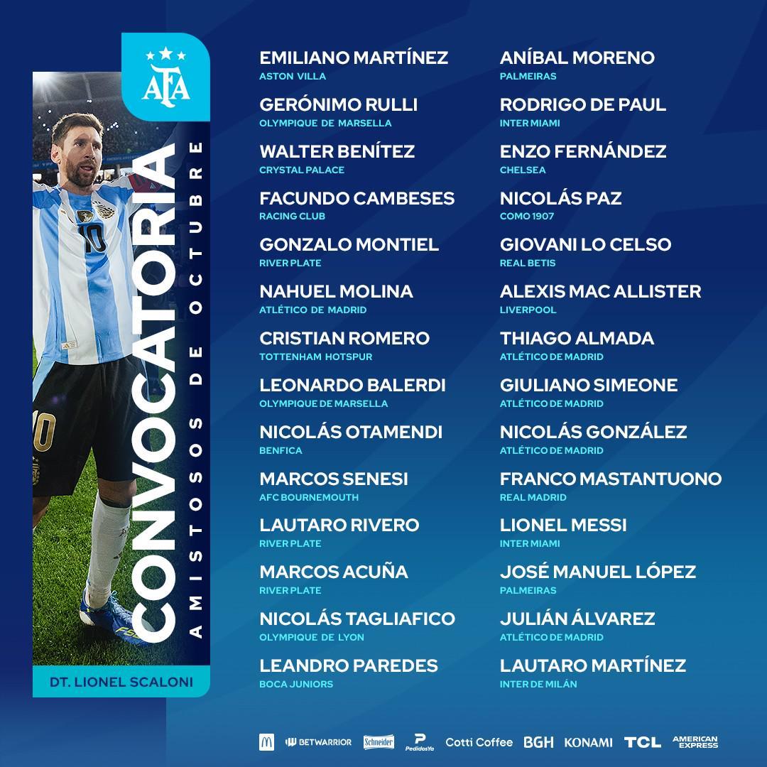 北京时间10月3日,阿根廷官方公布了10月在美国举行的友谊赛的大名单,梅西领衔,恩佐、阿尔瓦雷斯、罗梅罗在列。