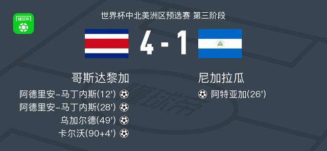 北京时间10月14日世界杯中北美洲区预选赛 第三阶段,哥斯达黎加对阵尼加拉瓜。哥斯达黎加阿德里安-马丁内斯梅开二度,乌加尔德破门,卡尔沃破门。尼加拉瓜阿特亚加破门。最终比分哥斯达黎加 4-1 尼加拉瓜。