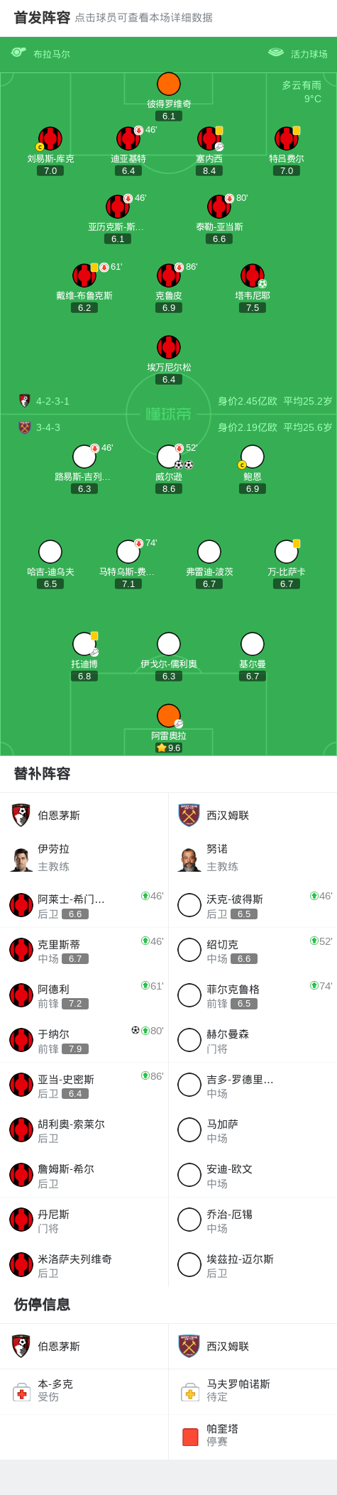 第81分钟,扳平比分,于纳尔替补上场首次触球即破门,伯恩茅斯2-2